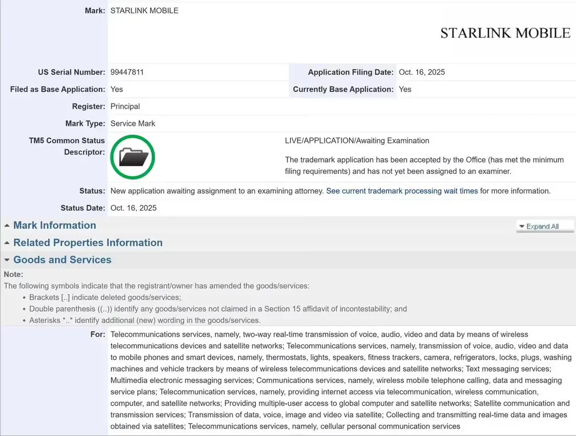 12 月 6 日消息,科技媒体 Notebook Check 昨日(12 月 5 日)发布博文,报道称 SpaceX 已经向美国专利商标局(USPTO)提交了“Starlink Mobile”商标申请,标志着埃隆・马斯克正式推进独立 5G 移动运营商计划。